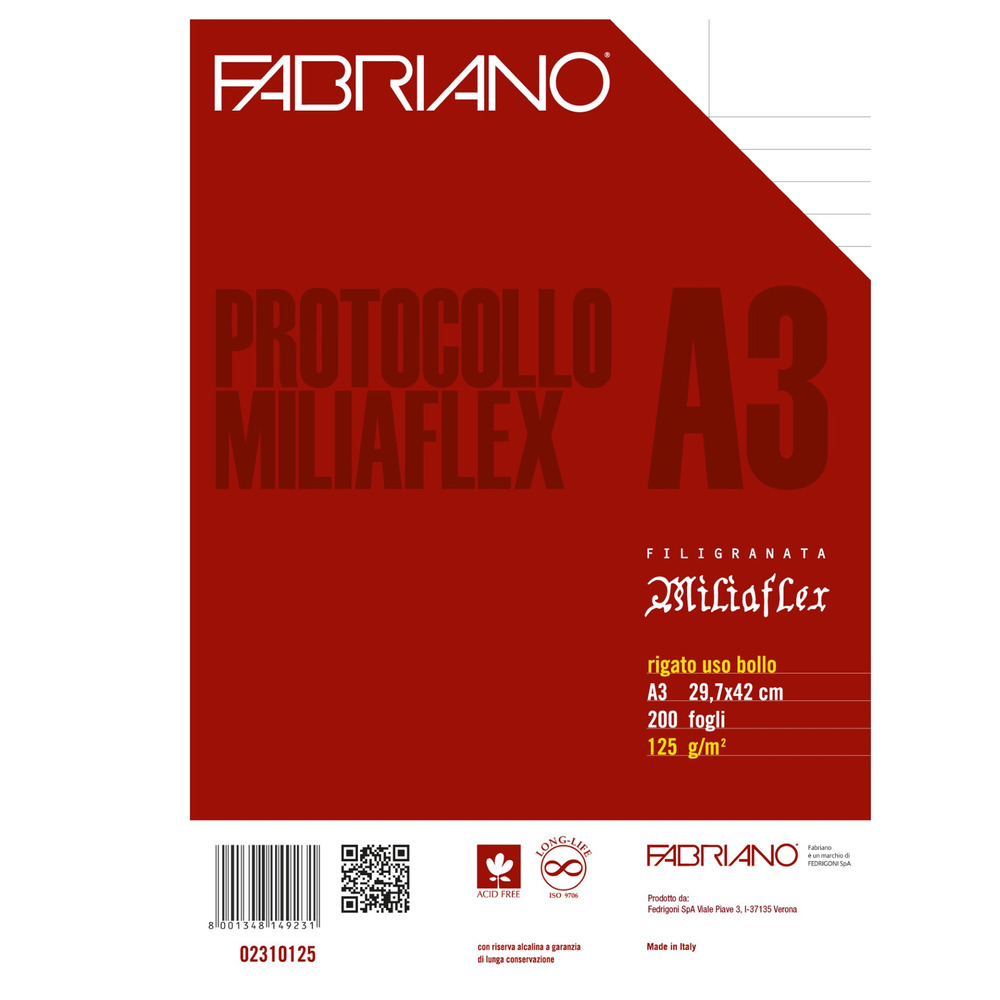 La filigrana è sparsa e riproduce la scritta Miliaflex/C. M. FABRIANO (su due righe).
