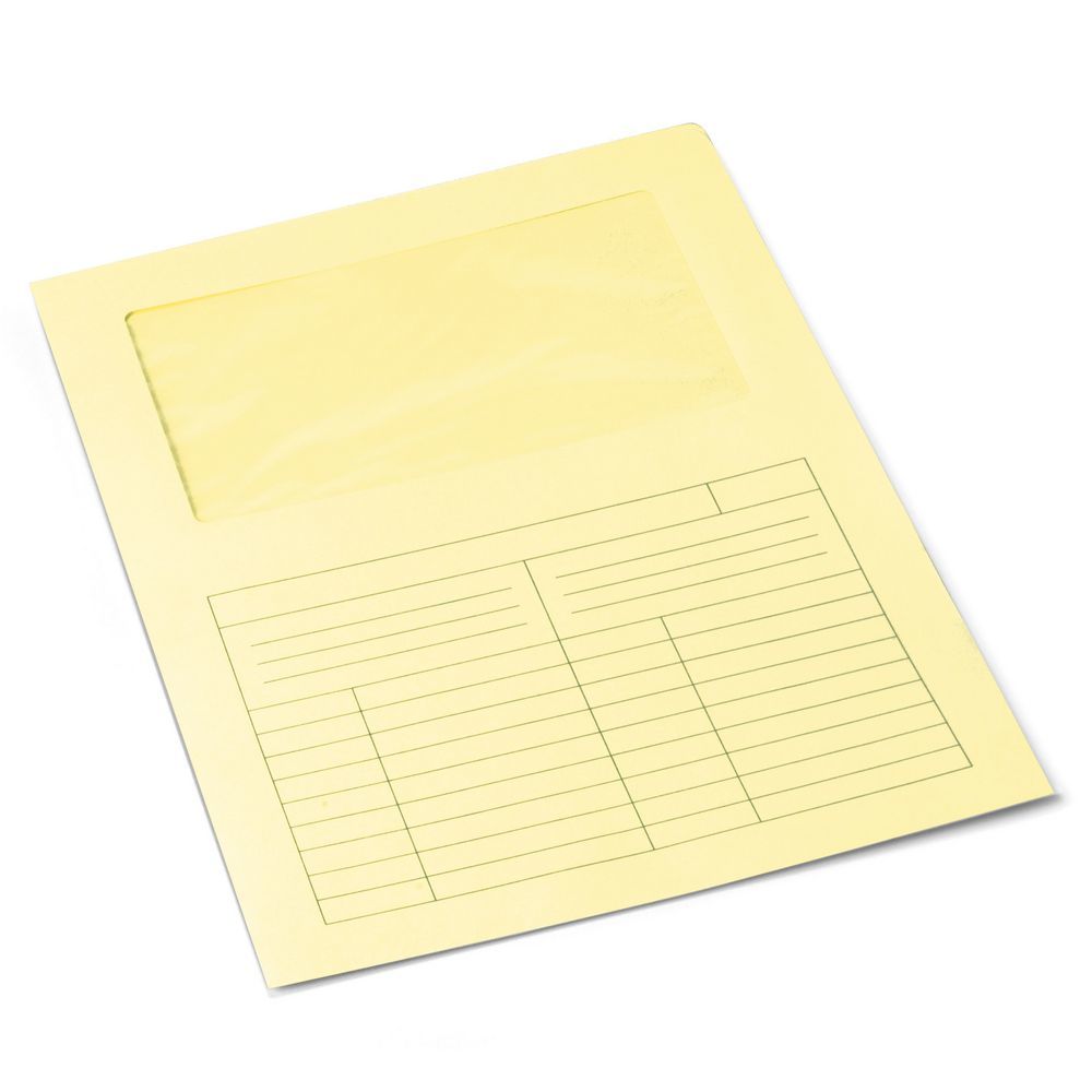 Cartellina in cartoncino stampato aperta su 2 lati ad “L” con finestratura superiore.