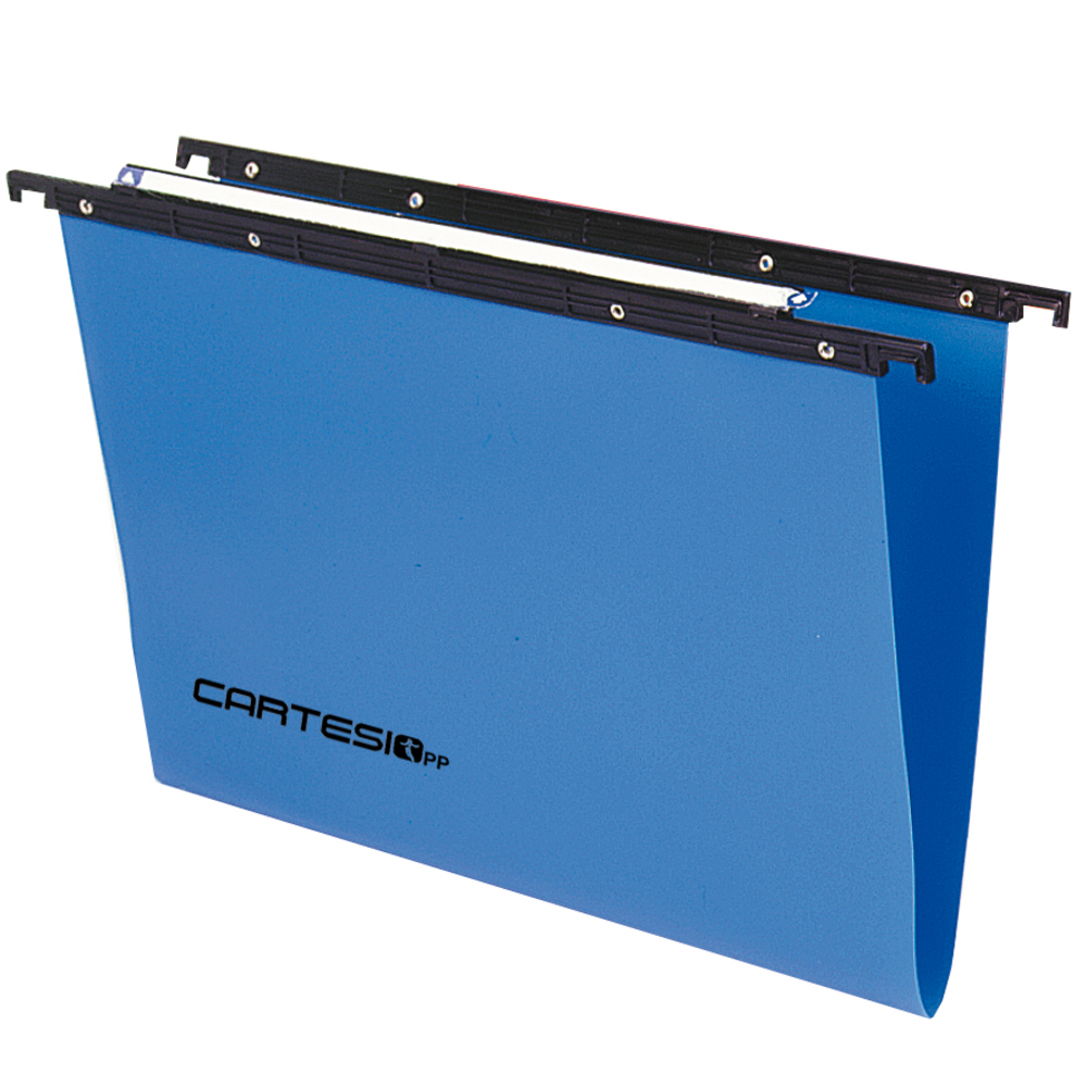 Cartelle sospese blu, realizzate con polipropilene riciclato (50% post-industriale) e aste in polistirene riciclato (90%). Fondo a V, interasse 39/39,8 cm e confezione da 25 pezzi. Durata garantita 20 anni.