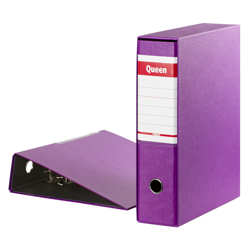 Registratori QUEEN Proced / Diem con cartella rivestita con materiale plastico e porta etichetta termosaldato sul dorso.