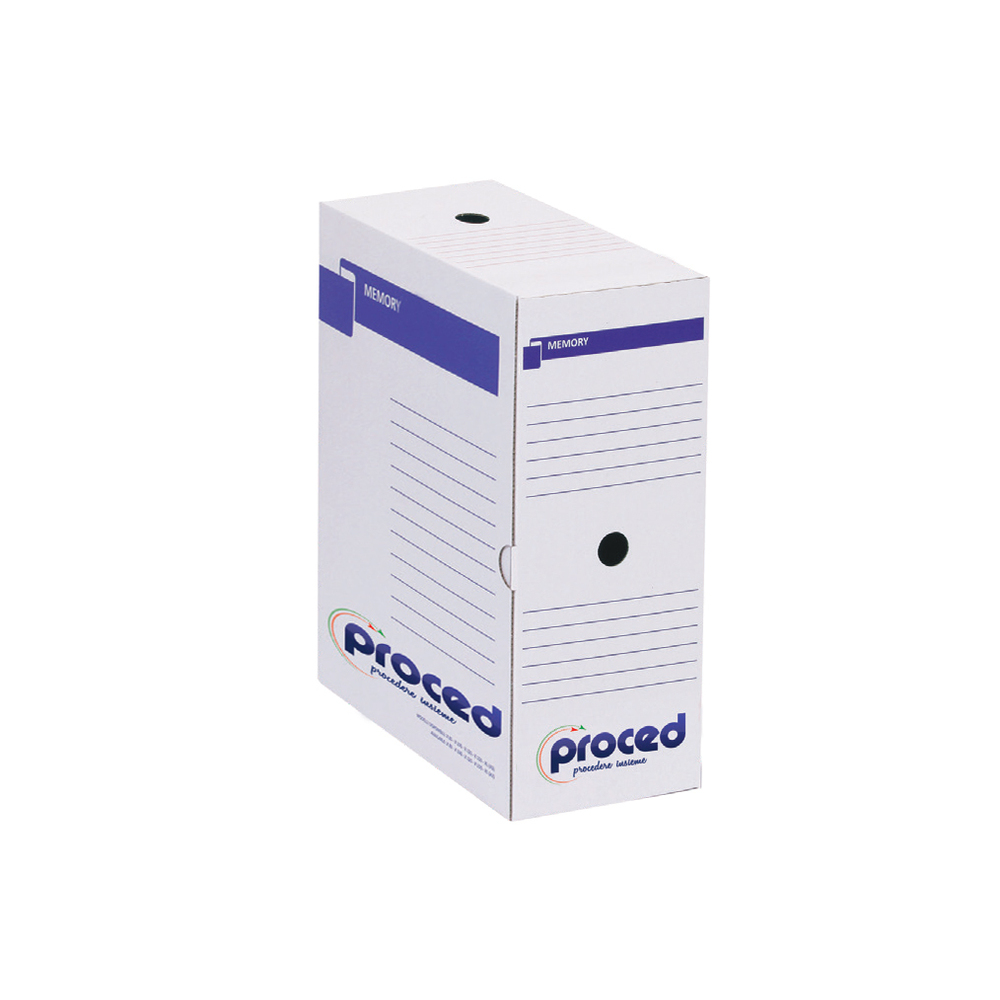 Scatole archivio MEMOPRO di Procede / Diem in cartone riciclato al 90% rivestito in kraft bianco e stampato con inchiostri a base d’acqua.