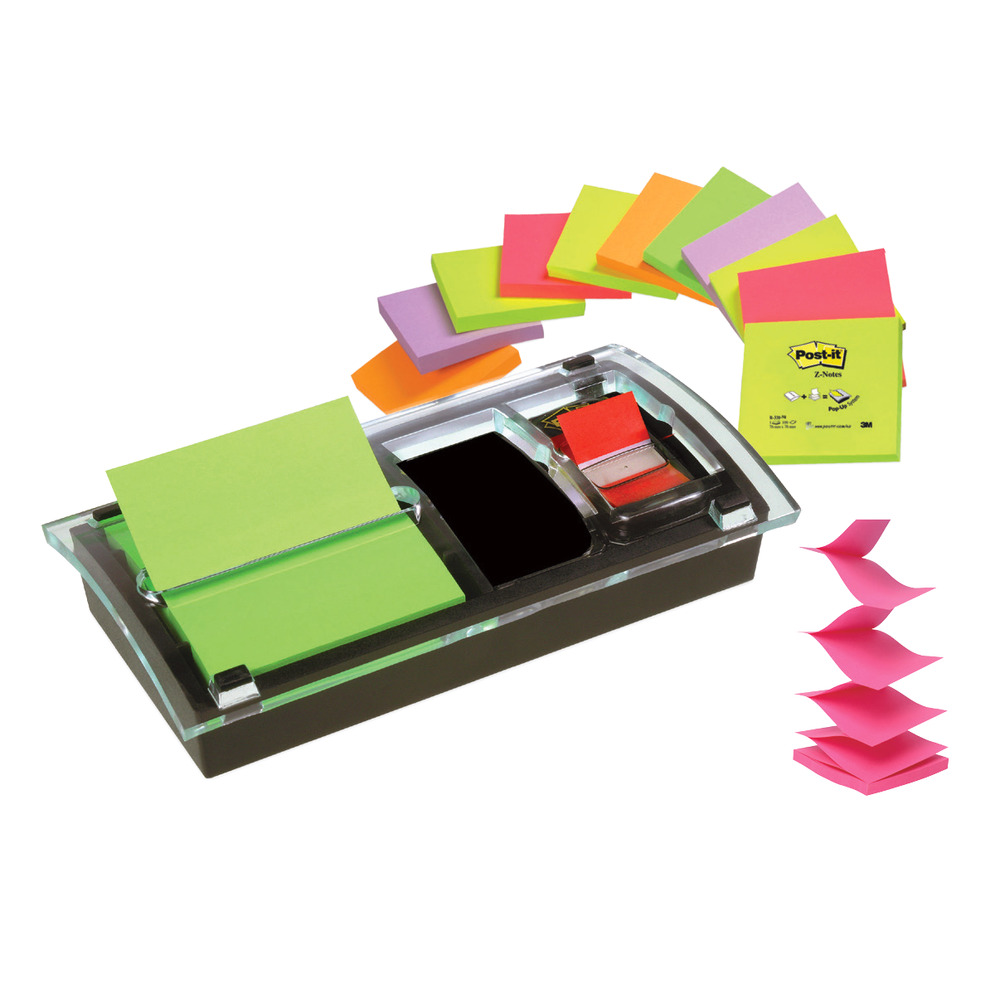 Set completo da scrivania: elegante dispenser da tavolo ricaricabile completo di 12 ricariche Post-it® Z-Notes colori assortiti ed 1 ricarica Post-it® Index 680 rosso