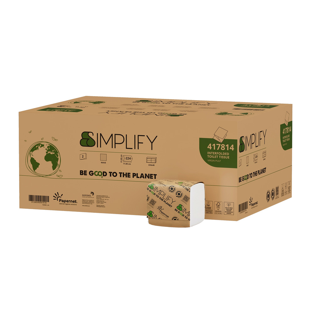 Carta igienica Interfogliata Simplify, 2 veli in pura cellulosa goffrata bianca. Fascette da 224 servizi, formato aperto 21x11 cm. Certificazioni EU Ecolabel e FSC.