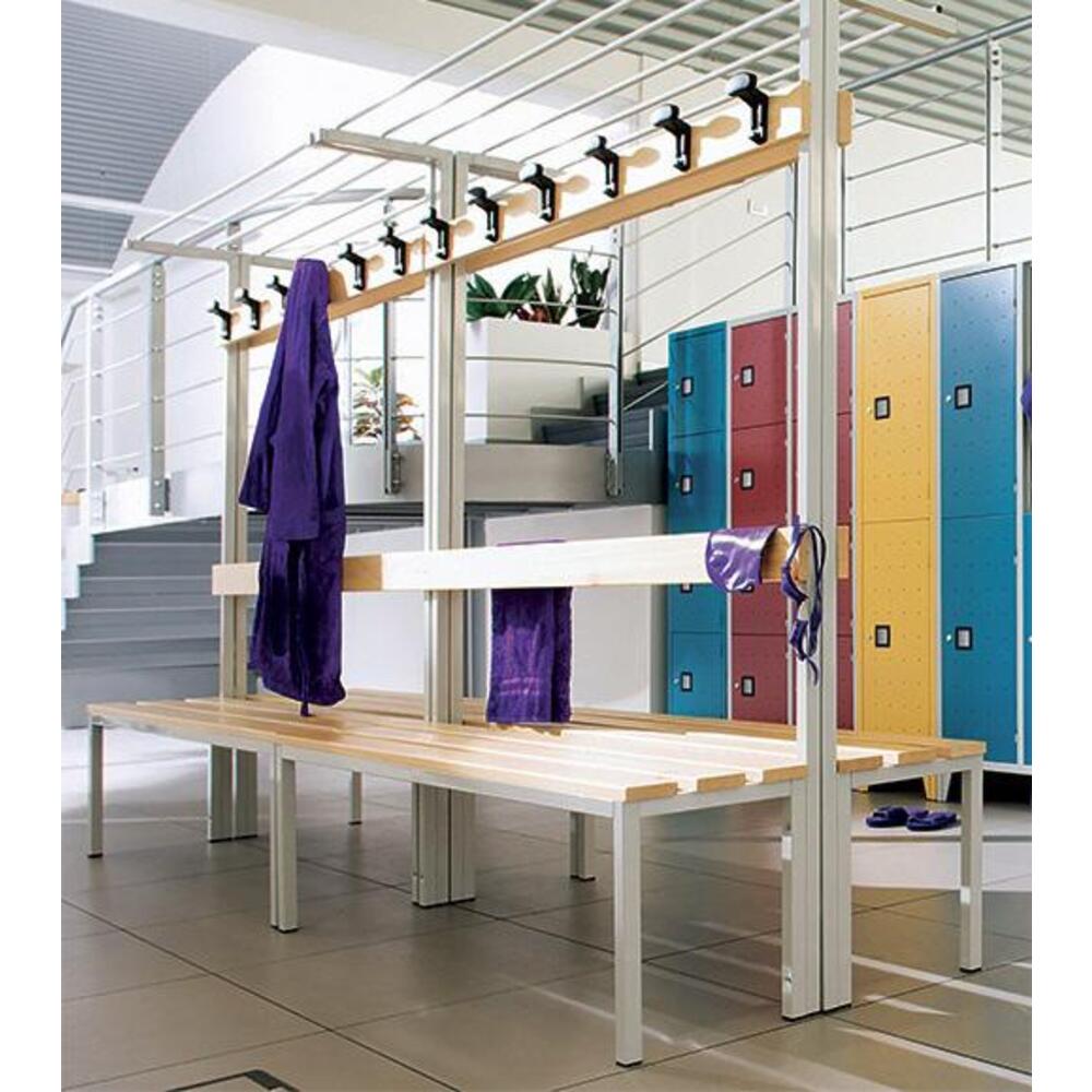 Strutture in tubolare d’acciaio 30x30mm, supporto della seduta e degli appendiabiti e portaborse in doghe di legno massello verniciato al naturale con fissaggio nascosto, puntali in materiale plastico. Smontata.