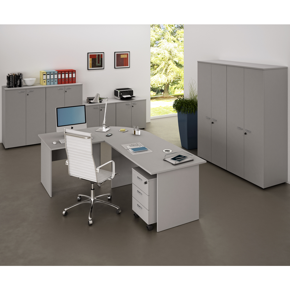 La gamma completa degli elementi permette di allestire ogni ambiente di lavoro, personalizzandolo con stile. Materiale bilaminato nobilitato melaminico spessore 22 e 18 mm conforme norme UNI e EN classe E1.