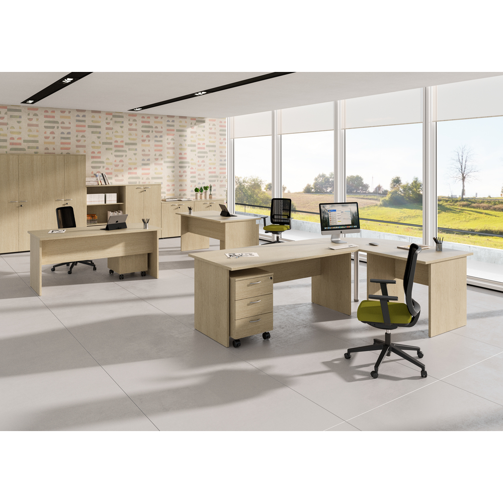 La gamma completa degli elementi permette di allestire ogni ambiente di lavoro, personalizzandolo con stile. Materiale bilaminato nobilitato melaminico spessore 22 e 18 mm conforme norme UNI e EN classe E1.