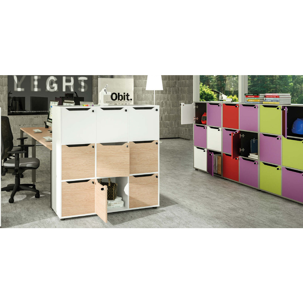 Contenitori a casellario Maxi Rainbow realizzati in melaminico bilaminato antigraffi o e antiriflesso conforme alle norme UNI e EN classe E1.