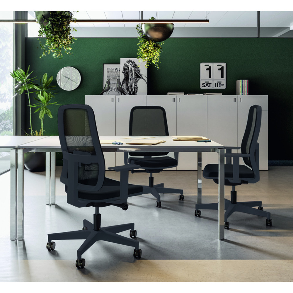 Schienale in rete nera, con supporto lombare lombare soft in poliuretano morbido regolabile in altezza.