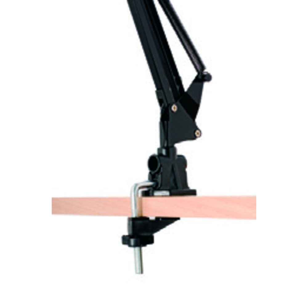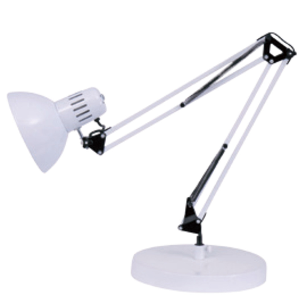 Lampada dotata di doppio braccio articolato in metallo, testa orientabile in metallo e plastica. Perfetta stabilità sia con la base appesantita rotonda che con il morsetto.