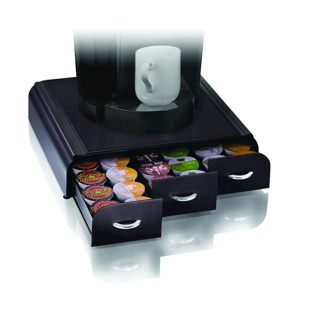 Modulo a 3 cassetti con maniglie cromate per un tocco di stile. La macchina del caffè può essere posizionata sul contenitore per risparmiare spazio. Realizzato in polistirene antiurto. Dimensioni: 34,2 x 32,7 x H 6,9 cm.
