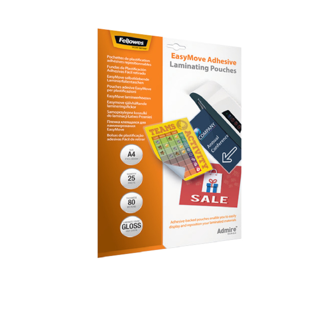 Fogli per plastificare Fellowes con retro adesivo perfette per plastificare, ad esempio, avvisi e cartelli.