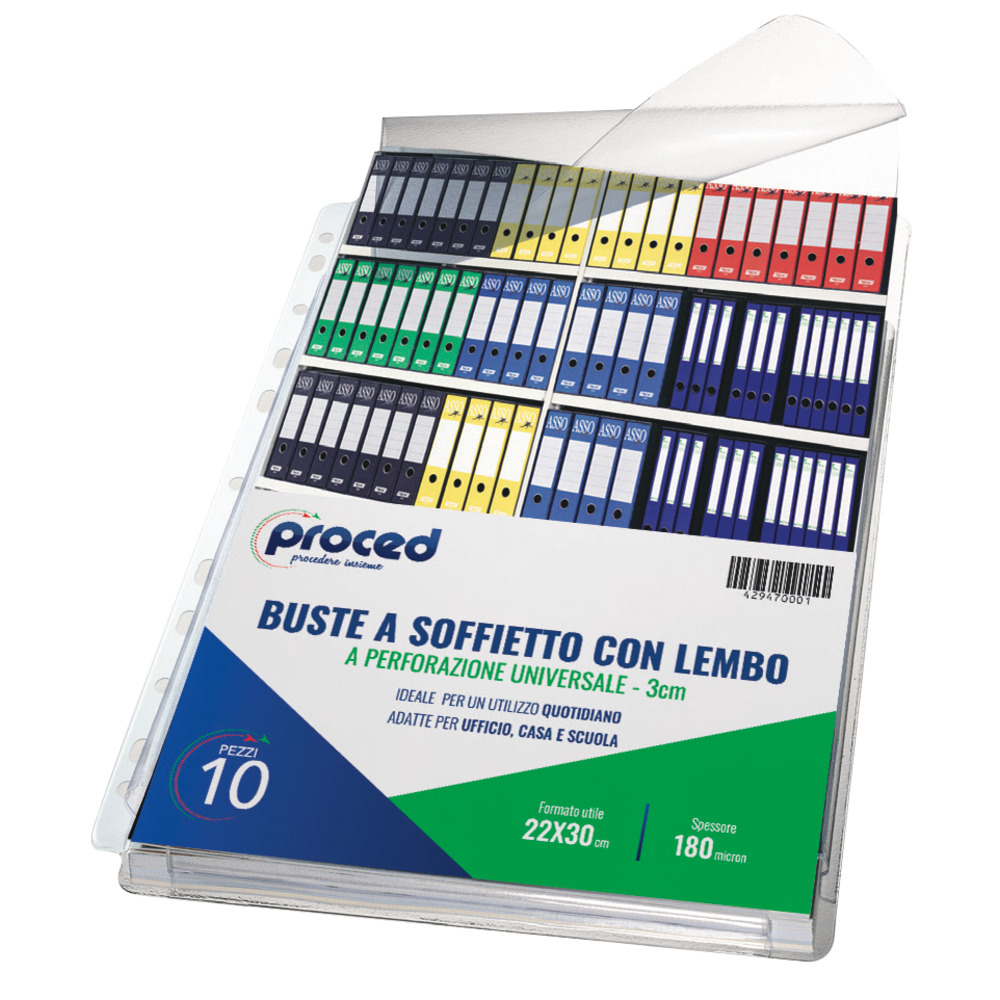 Busta a marchio Proced / Diem con perforazione universale rinforzata ad alto spessore antiriflesso con lembo superiore di chiusura, ideale per archiviare documenti voluminosi, brochure e cataloghi.