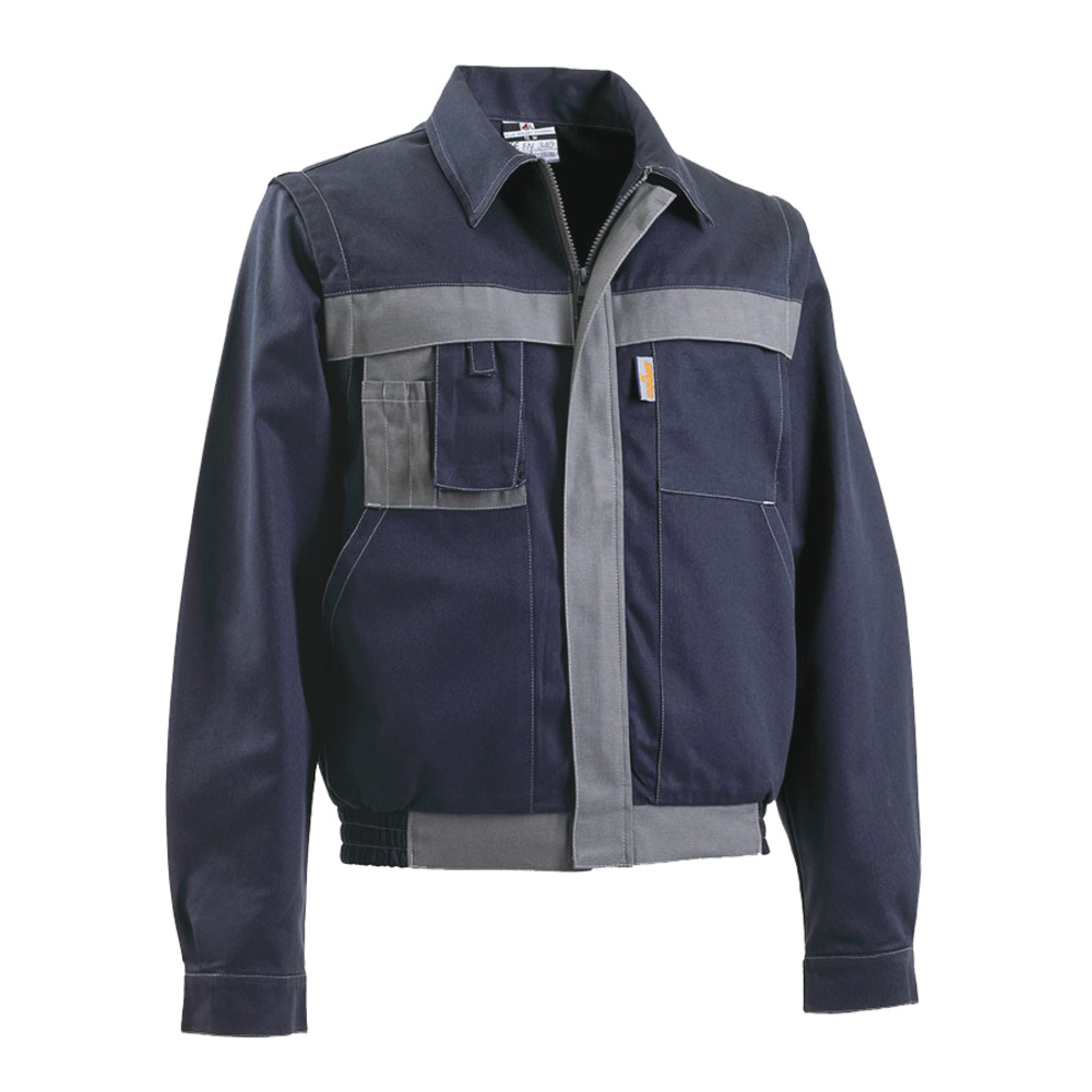 Giubbino lavoro modello “Globo” di Global Trading con cerniera coperta, elastici laterali al girovita, velcro ai polsi, maniche staccabili con cerniera, due tasconi, taschino con portapenne e portacellulare.
