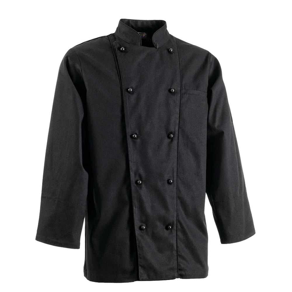 Giacca da cuoco manica lunga, doppio petto, chiusura con bottoni estraibili, taschino lato cuore e doppio taschino su manica sinistra.
