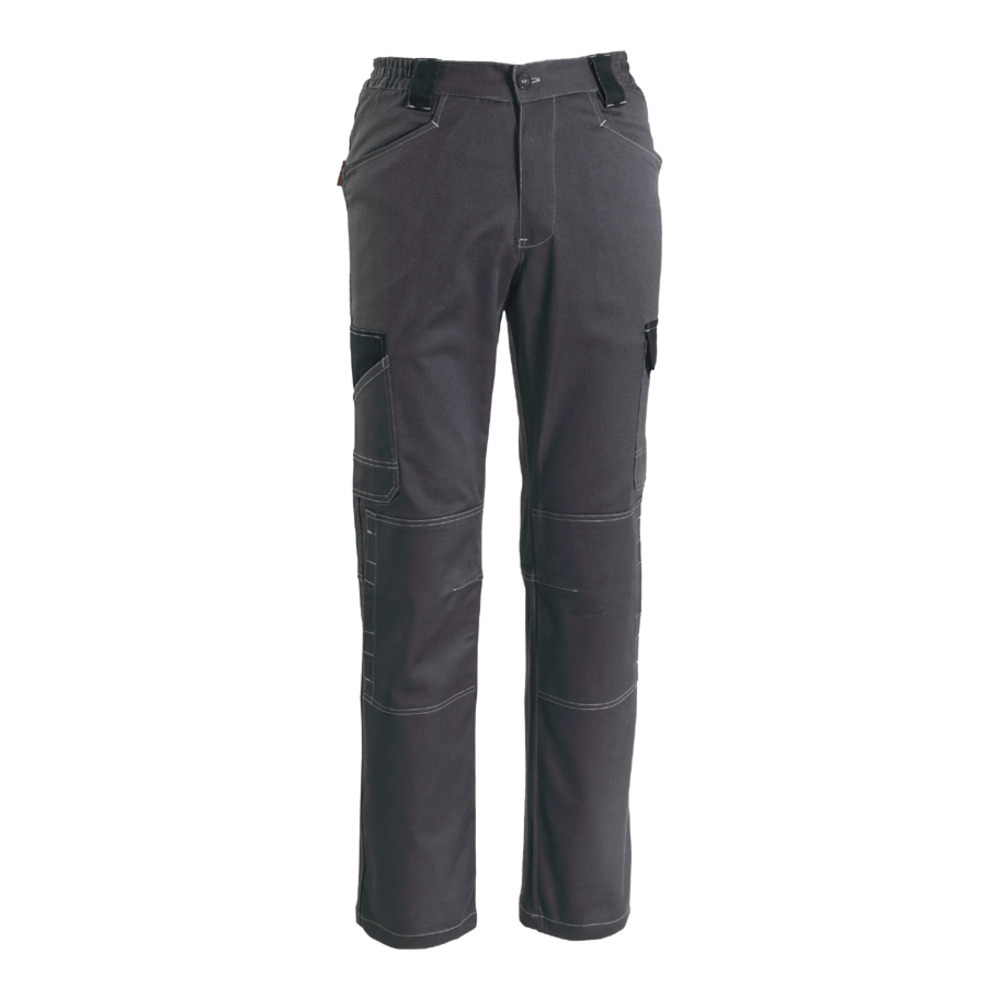 Pantalone lavoro “Speedy” di Global Trading con bottoni coperti, elastici laterali in vita, due tasche anteriori, due tasche posteriori con velcro, tascone con pattina su gamba sinistra, doppia tasca applicata su gamba destra, aperture per inserimento protezioni alle ginocchia.