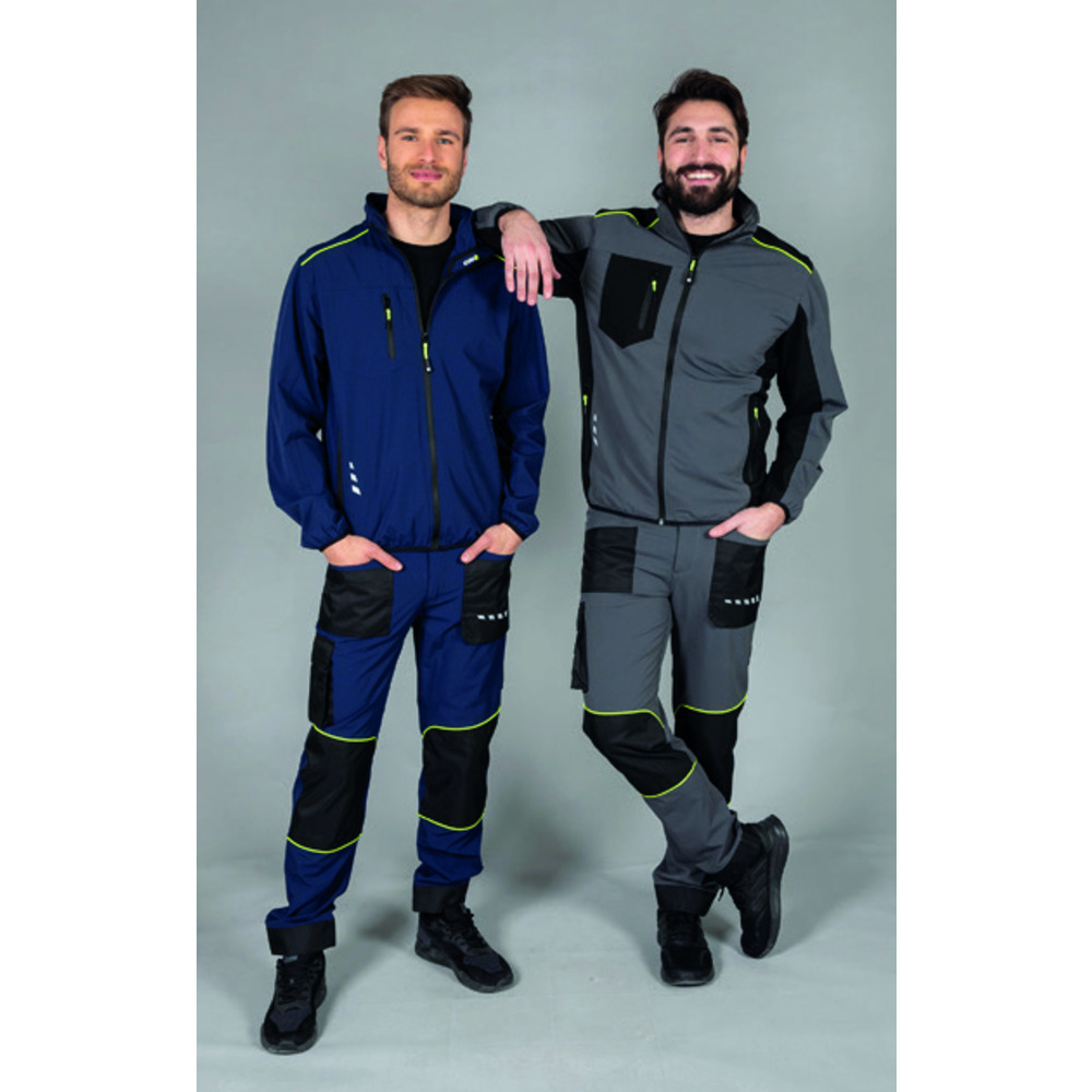 Tessuto di rinforzo color nero, in nylon 400D antistrappo, stampe rifrangenti anteriori e posteriori 2 tasche anteriori, con bottoni automatici coperti, doppio portapenne e passante porta utensile portametro e portautensili. Impermeabile.