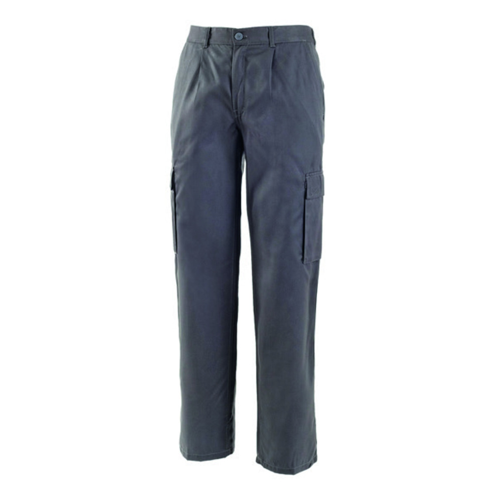 Pantalone Work multitasche di Global Trading con elastico in vita, cerniera coperta, due tasche, due tasconi posteriori e due tasconi laterali tutti chiusi da pattina con velcro.