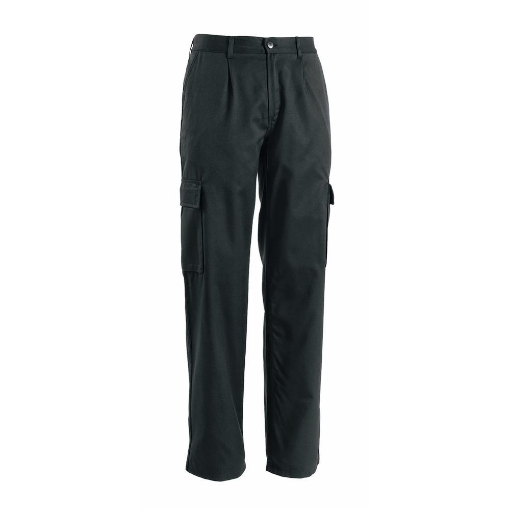 Pantalone Work multitasche di Global Trading con elastico in vita, cerniera coperta, due tasche, due tasconi posteriori e due tasconi laterali tutti chiusi da pattina con velcro.