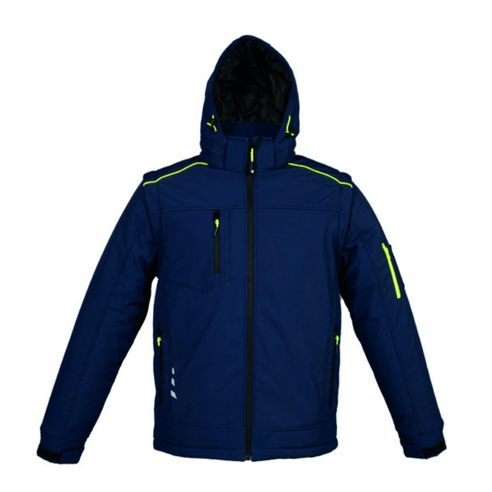 Giubbino softshell impermeabile con cappuccio imbottito e maniche staccabili tramite zip. Tessuto esterno in poliestere ed elastane, fodera e imbottitura in poliestere.