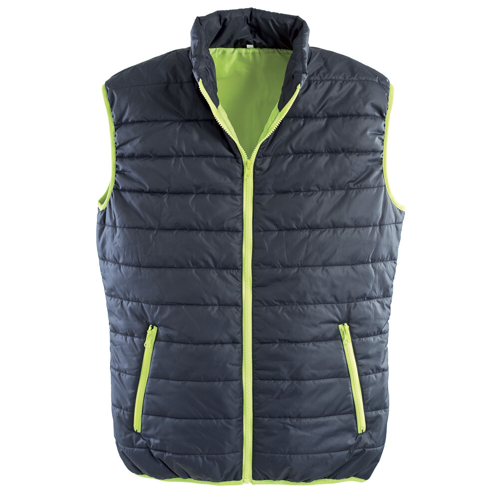 Gilet Paris di P&P con giromanica elasticizzato, fodera interna e cerniera fluo, due tasche inferiori chiuse con cerniera fluo e fondo elasticizzato.