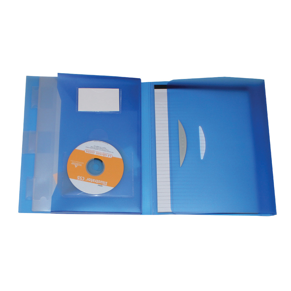 Contiene un blocco da 25 fogli, portapenne, tasca trasparente porta CD e porta biglietto da visita.