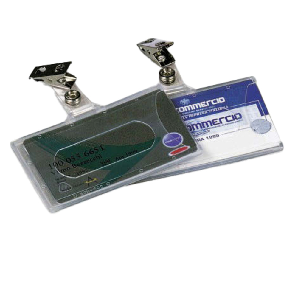 Portabadge Lebez Pocket in PVC trasparente, con spazio per l'estrazione agevole e clip metallica. Confezione da 100 pezzi, ideale per un uso pratico e sicuro.