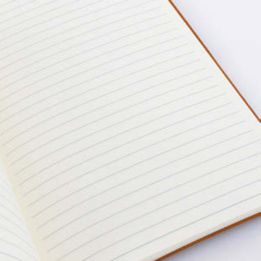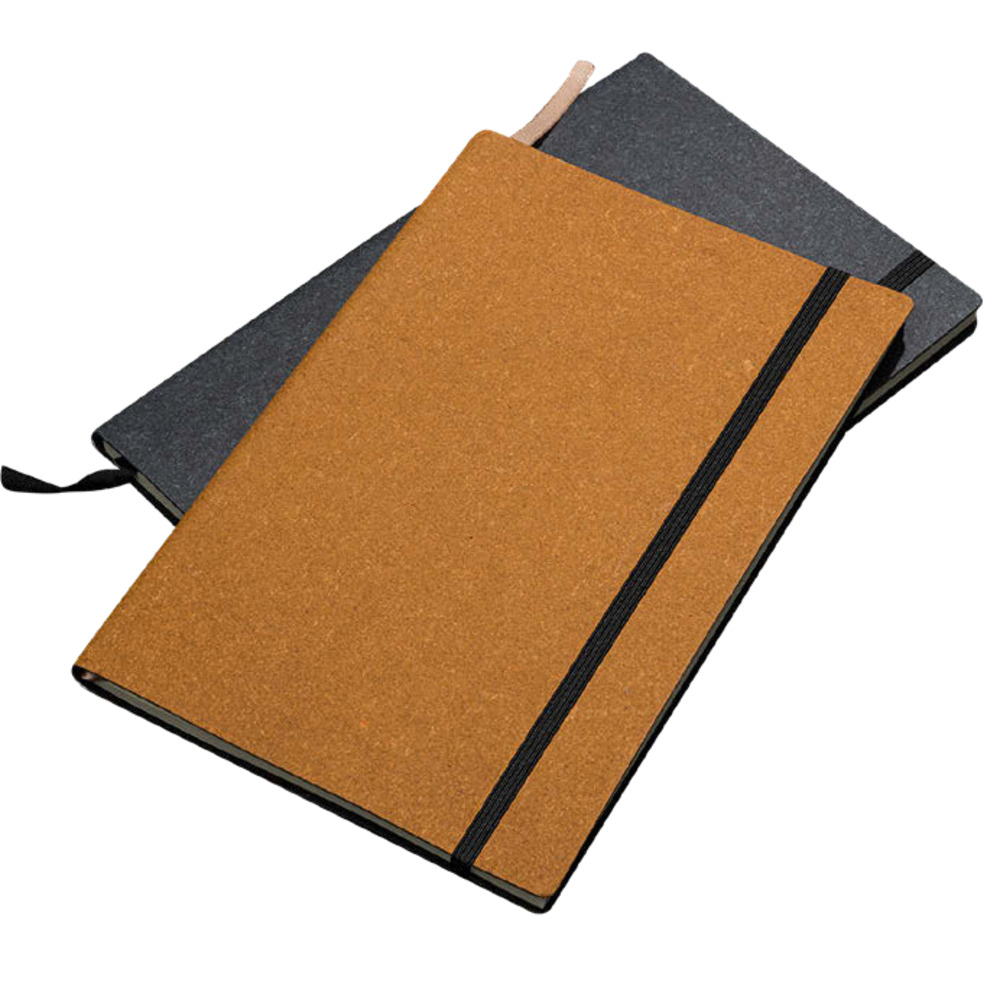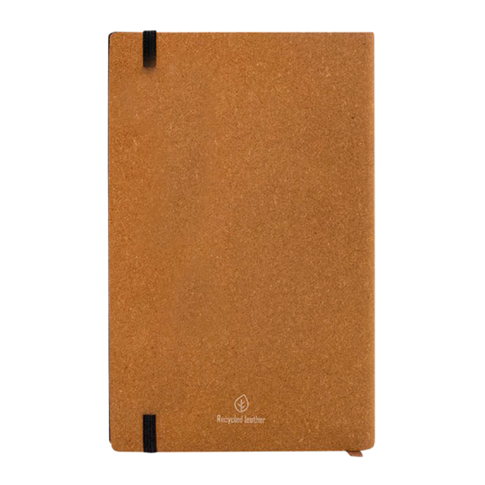 Notebook A5 in pelle riciclata, con 80 fogli crema a righe da 70gr. Include segnapagina ed è chiuso da un elastico. Le dimensioni sono 13,5x20,5x1 cm.