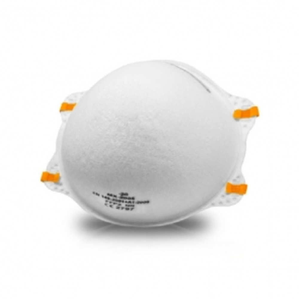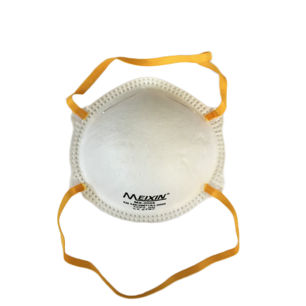 Mascherina filtrante monouso DPI con forma a conchiglia senza valvola, costituita da diversi strati di materiale filtrante.