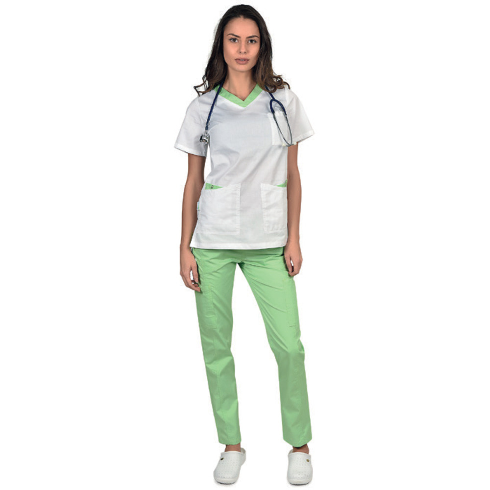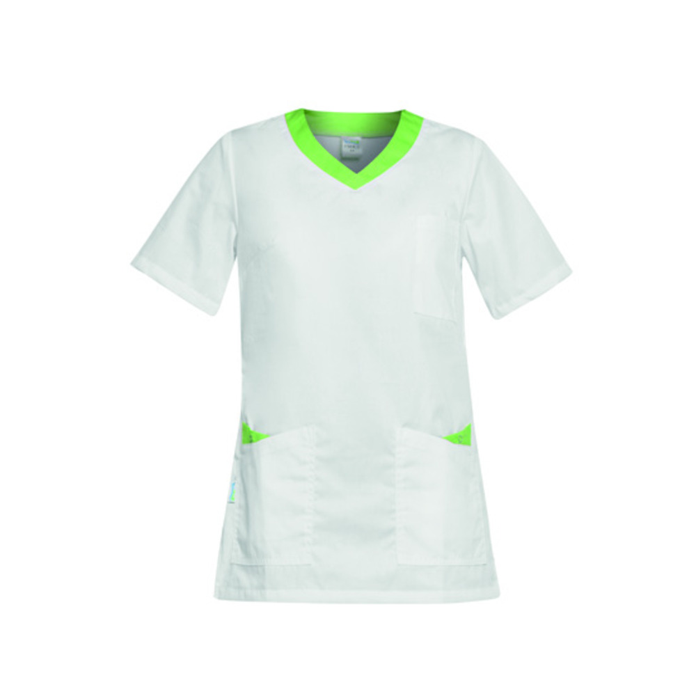 Casacca donna di Global Treding adatta all’ambiente sanitario (studi medici , dentisti, veterinari...) in polyestere cotone stretch con inserti colorati, una tasca superiore e due doppie inferiori, di cui una chiusa con bottone a pressione.