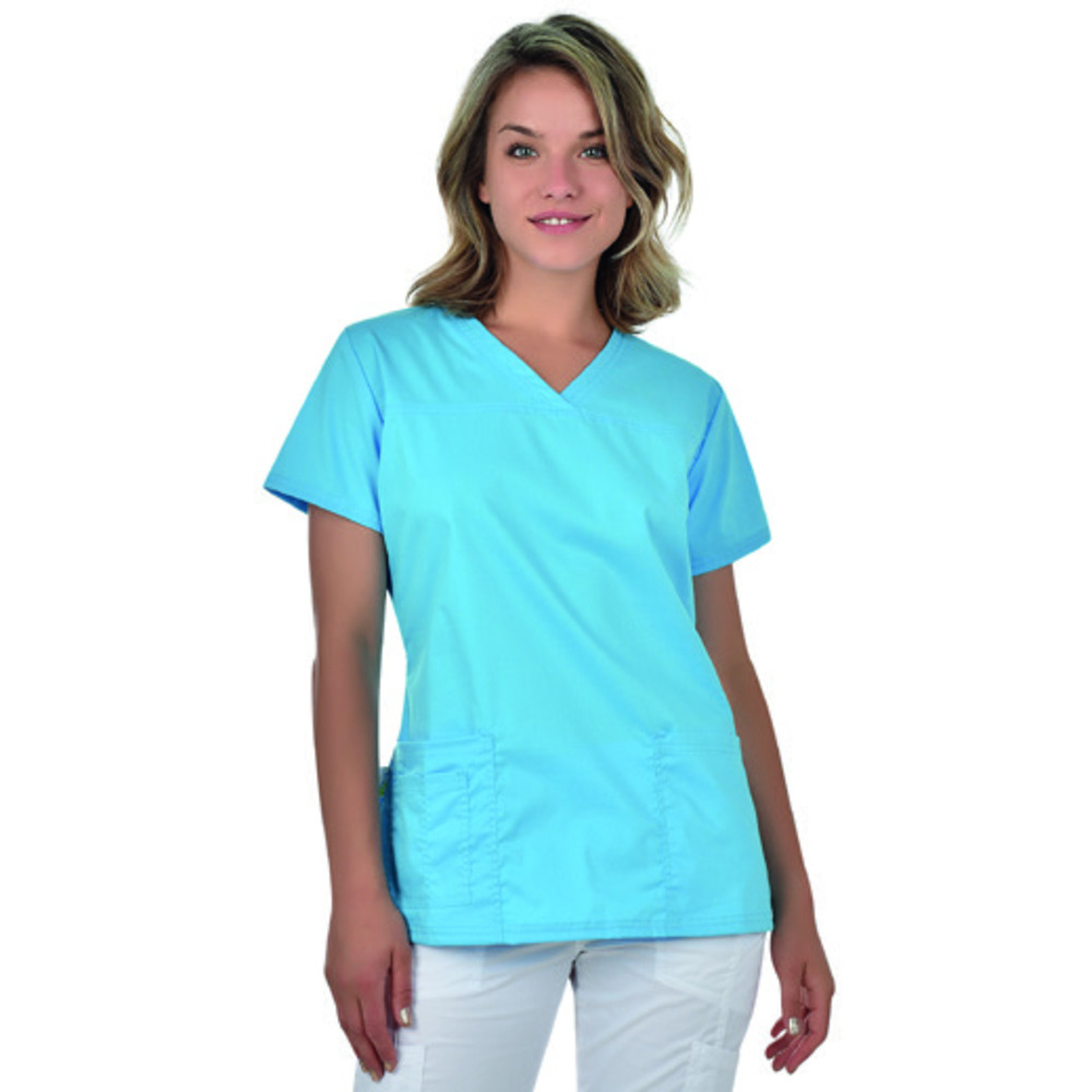 Casacca donna Global Trading adatta all’ambiente sanitario (studi medic , dentisti, veterinari ...) in polyestere cotone stretch tinta unita collo a V, due tasche frontali di cui una con porta penna.