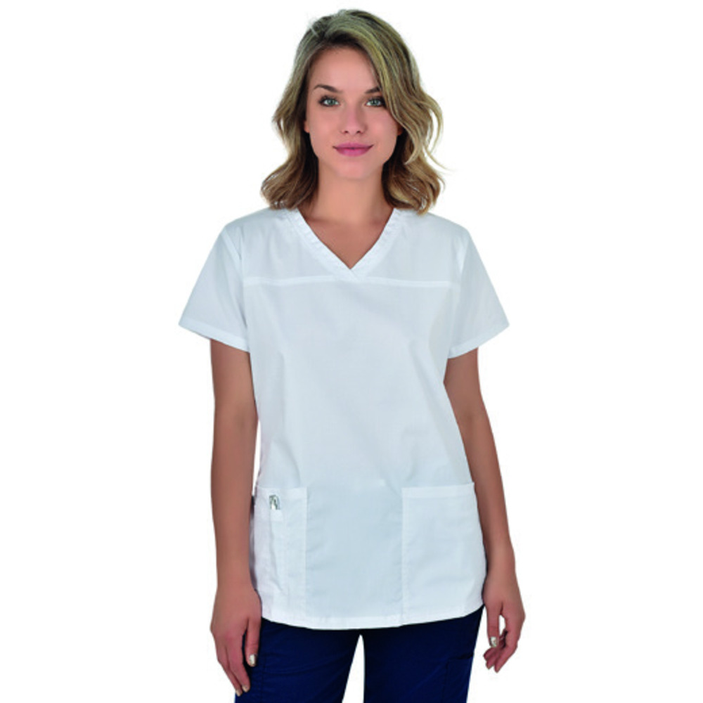 Casacca donna Global Trading adatta all’ambiente sanitario (studi medic , dentisti, veterinari ...) in polyestere cotone stretch tinta unita collo a V, due tasche frontali di cui una con porta penna.