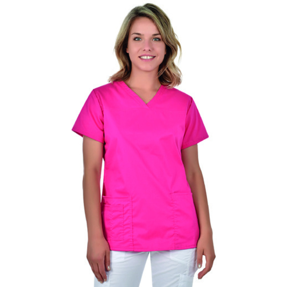 Casacca donna Global Trading adatta all’ambiente sanitario (studi medic , dentisti, veterinari ...) in polyestere cotone stretch tinta unita collo a V, due tasche frontali di cui una con porta penna.