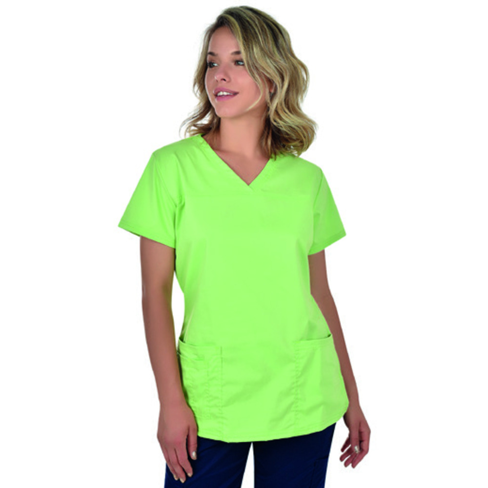 Casacca donna Global Trading adatta all’ambiente sanitario (studi medic , dentisti, veterinari ...) in polyestere cotone stretch tinta unita collo a V, due tasche frontali di cui una con porta penna.