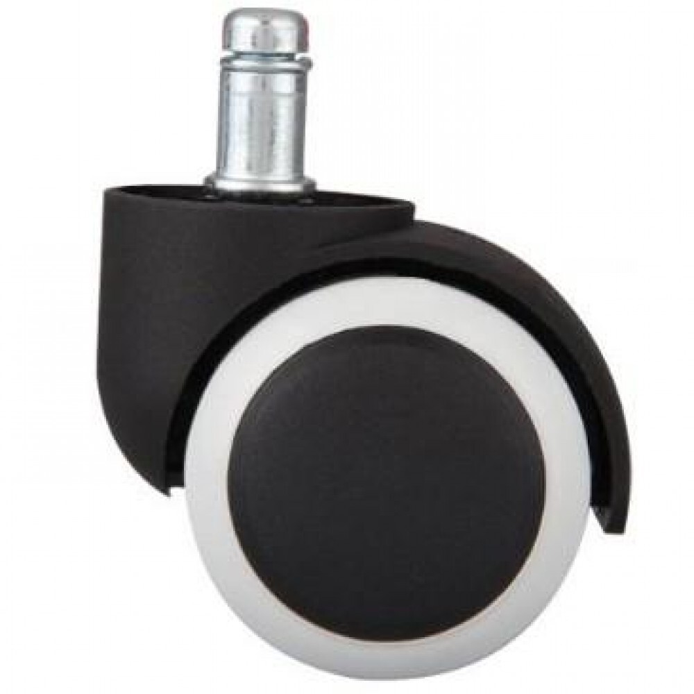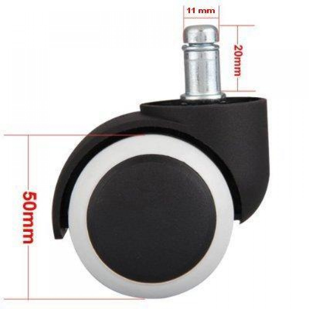 Set di 5 ruote gommate di ricambio per poltrone da ufficio. Ideali per pavimenti duri come parquet, ceramica e marmo. Il diametro del perno è di 11 mm.