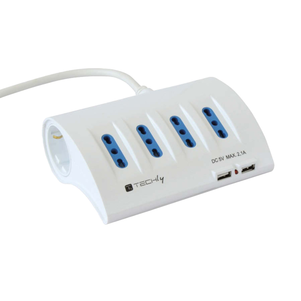 Multipresa da tavolo di Techly con 4 prese italiane bipasso 2 schuko e 2 USB bianca.