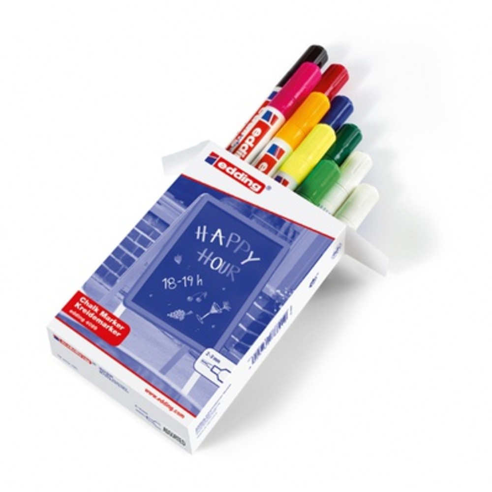 Marcatore Edding 4095 a gesso liquido e a base d’acqua coprente, inodore e cancellabile con panno umido da tutte le superfici non porose.