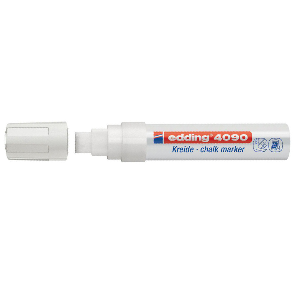 Marcatore Edding 4090 a gesso liquido e a base d’acqua coprente, inodore e cancellabile con panno umido da tutte le superfici non porose.