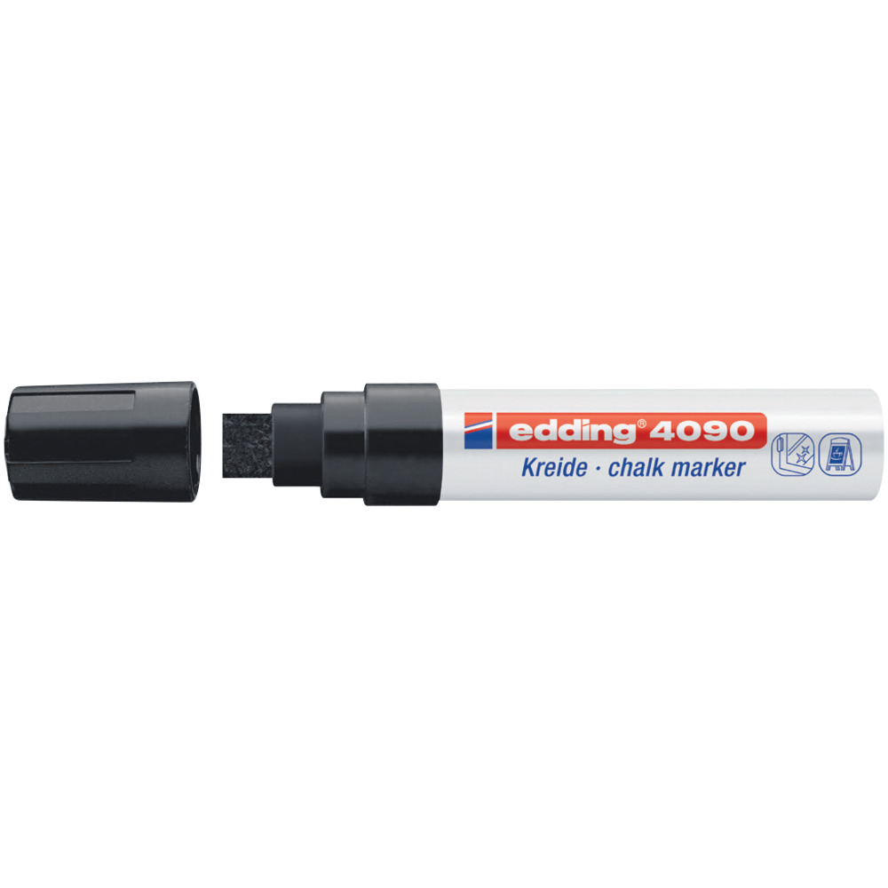 Marcatore Edding 4090 a gesso liquido e a base d’acqua coprente, inodore e cancellabile con panno umido da tutte le superfici non porose.