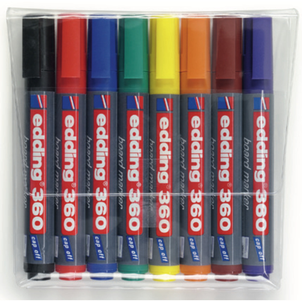 Marcatori Edding 360 punta conica per lavagne bianche con inchiostro pigmentato inodore.