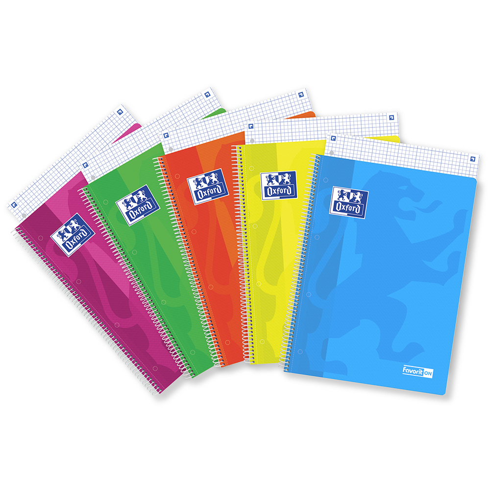 I maxi quaderni spiralati A4+ Favorit Oxford Neon donano un tocco di colore grazie alla copertina con effetto Touch in 4 brillanti colori fluo: arancio, verde, rosa e giallo.