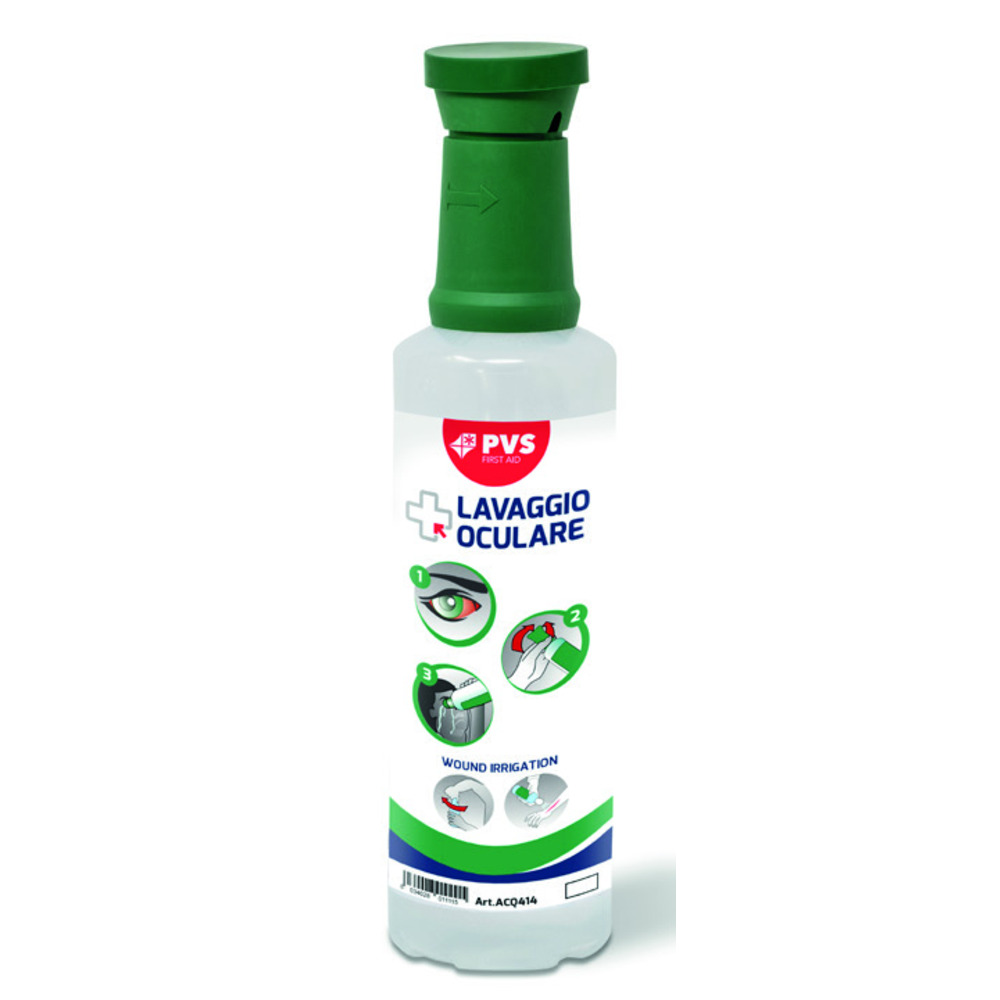 Soluzione sterile di cloruro di sodio 0,9% per il lavaggio oculare d'emergenza. Il flacone è pronto all'uso e rappresenta un ricambio idoneo per la stazione DROP (ACQ414).