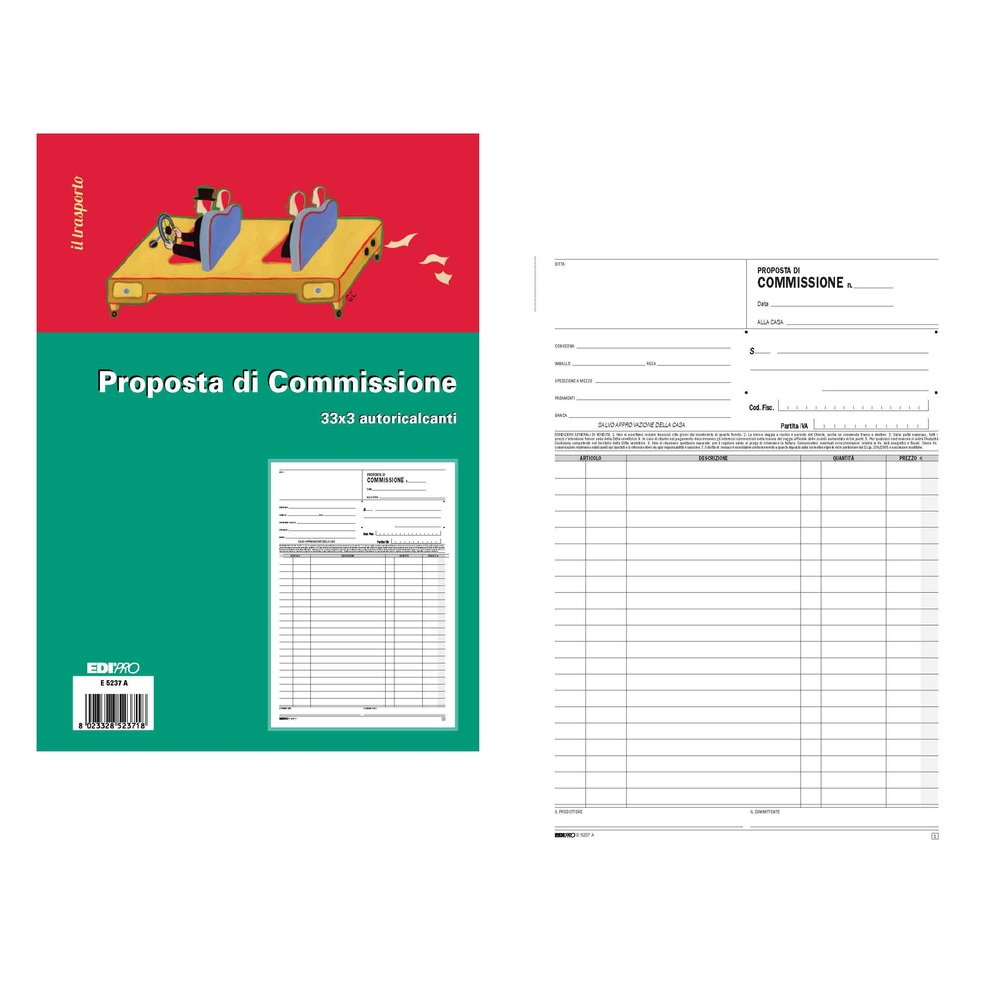 Blocco commissioni Edipro, formato A4 (33x3). Utile per appunti e comunicazioni, è composto da 3 copie di carta chimica. Codice prodotto: E5237A.