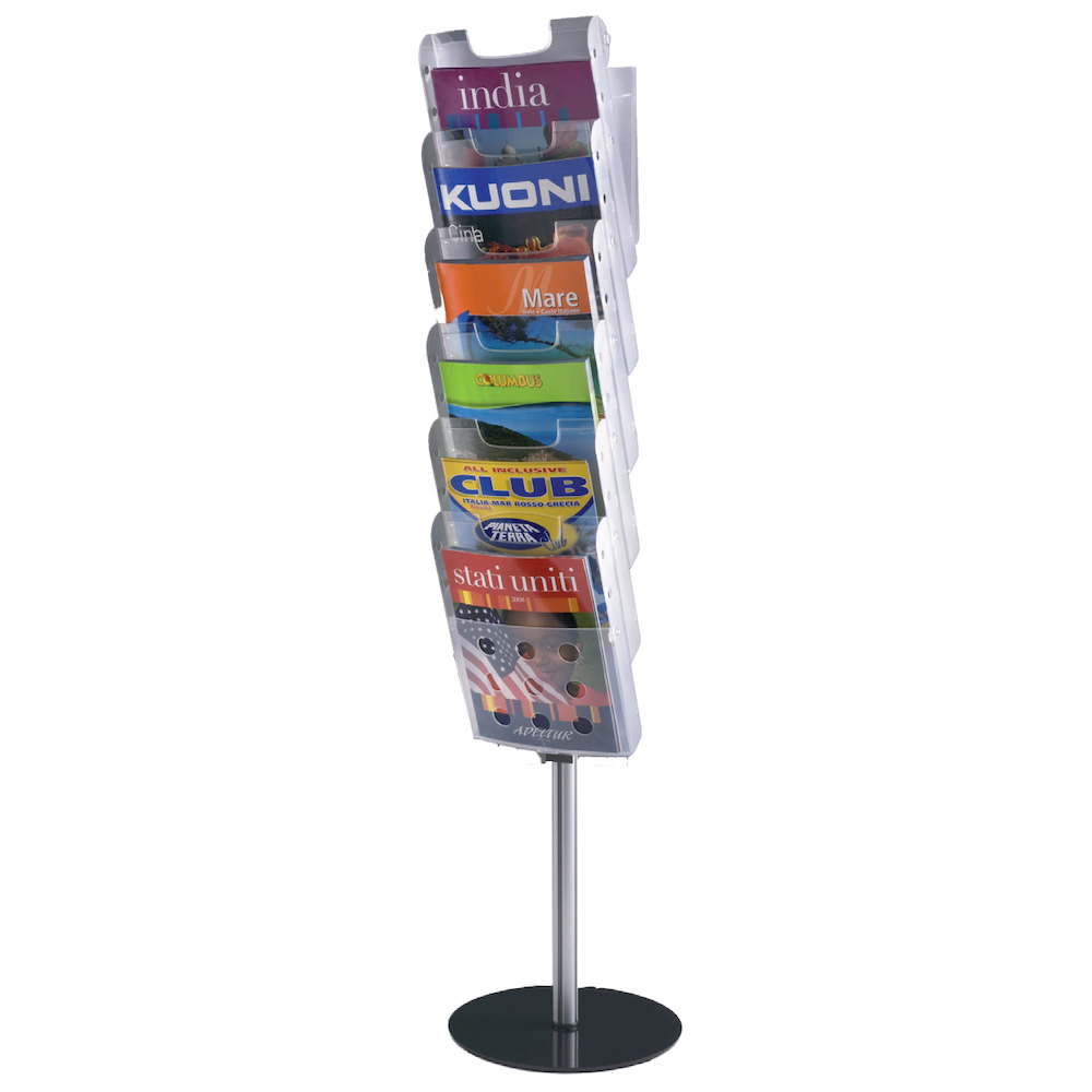 Espositore monofronte con vaschette Stacker in materiale plastico antiurto satinato, agganciabili tra loro con sistema a scatto.