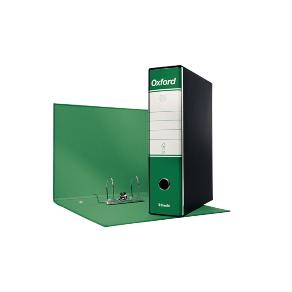 Registratori Oxford di Esselte con struttura in cartone da 2 mm di spessore rivestito di carta goffrata con finitura lino.