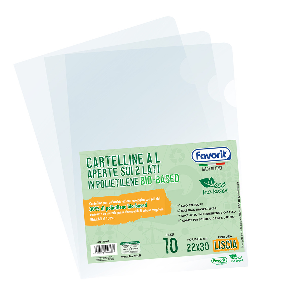 Cartelline a L in polietilene Favorit di cui almeno il 30% a base bio (BIO-BASED) derivante da materie prime rinnovabili di origine vegetale.
