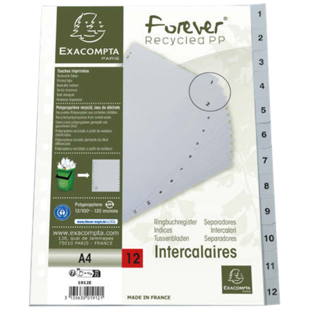 Divisori polipropilene riciclato Exacompta intercalari per registratori ad anelli, realizzati in PPL riciclato 120 micron, proveniente da scarti di plastica.
