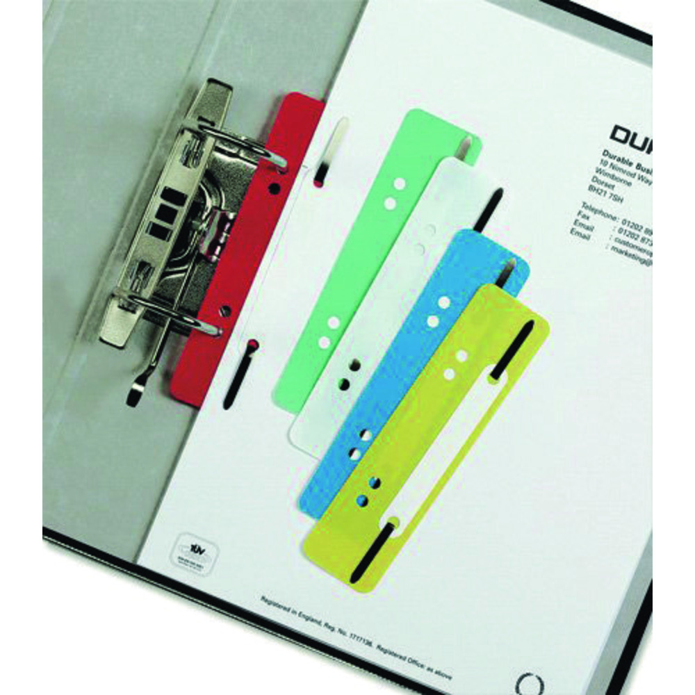 Fermafogli DURABLE in polipropilene, indispensabile per archiviare e conservare documenti con foratura passo 80 mm.