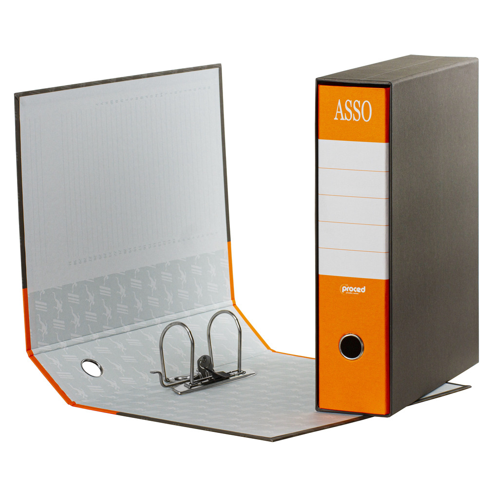 Registratori a marchio Proced / Diem con struttura in cartone accoppiato grigio di prima qualità, rivestito con carta goffrata anti-impronta.