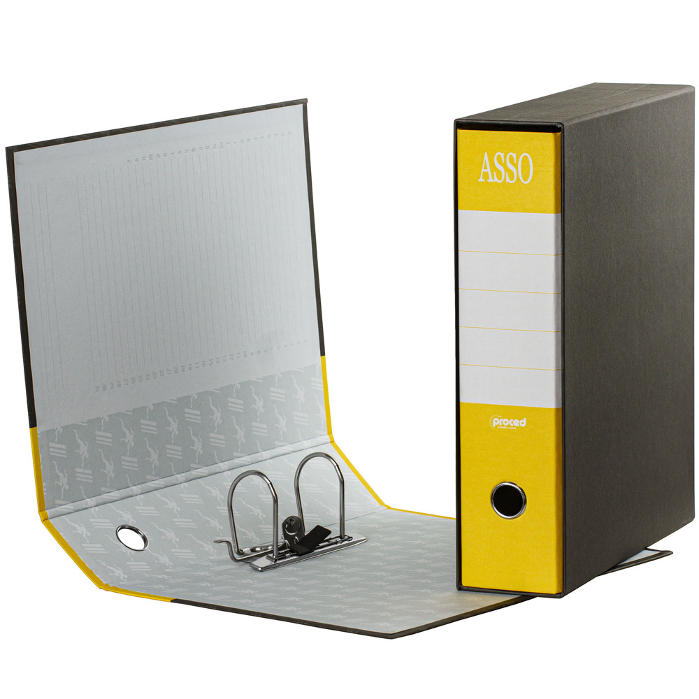Registratori a marchio Proced / Diem con struttura in cartone accoppiato grigio di prima qualità, rivestito con carta goffrata anti-impronta.