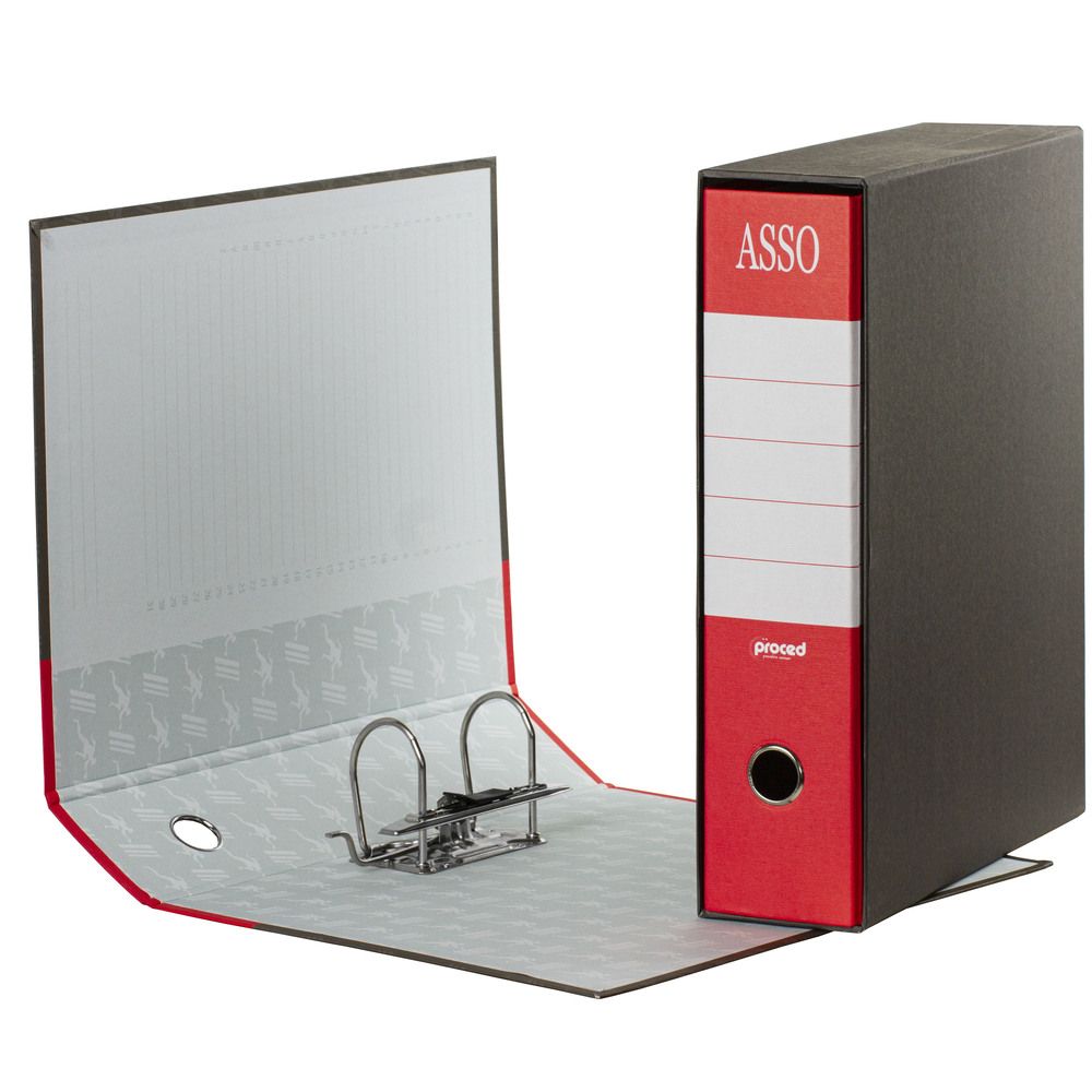 Registratori a marchio Proced / Diem con struttura in cartone accoppiato grigio di prima qualità, rivestito con carta goffrata anti-impronta.